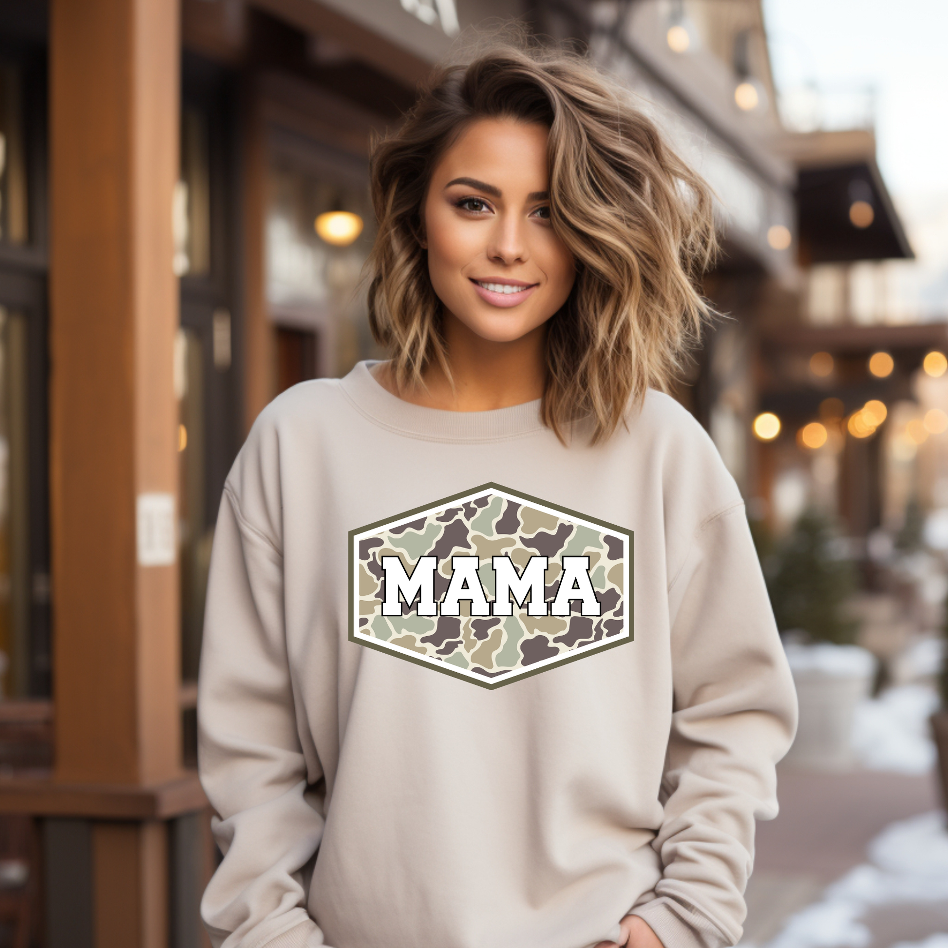 Rock this cozy Mama Camo Sweatshirt and show the world you're ready for anything—from school runs to weekend adventures. The classic camo pattern gets a playful twist with "Mama" front and center. Soft, comfortable, and perfect for layering, this sweatshirt celebrates the warrior in every mom. Grab yours and wear your superpowers with style. Available in 2 colors.