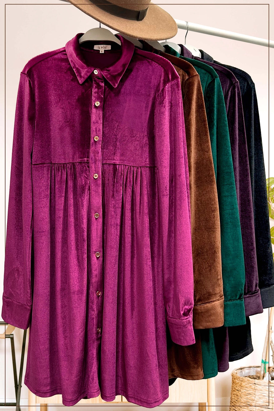 This goes-with-anything velvet dress is featured in a relaxed fit with a button-front closure and a classic collar. You can either dress up or down with this gorgeous style. Color is Ruby.